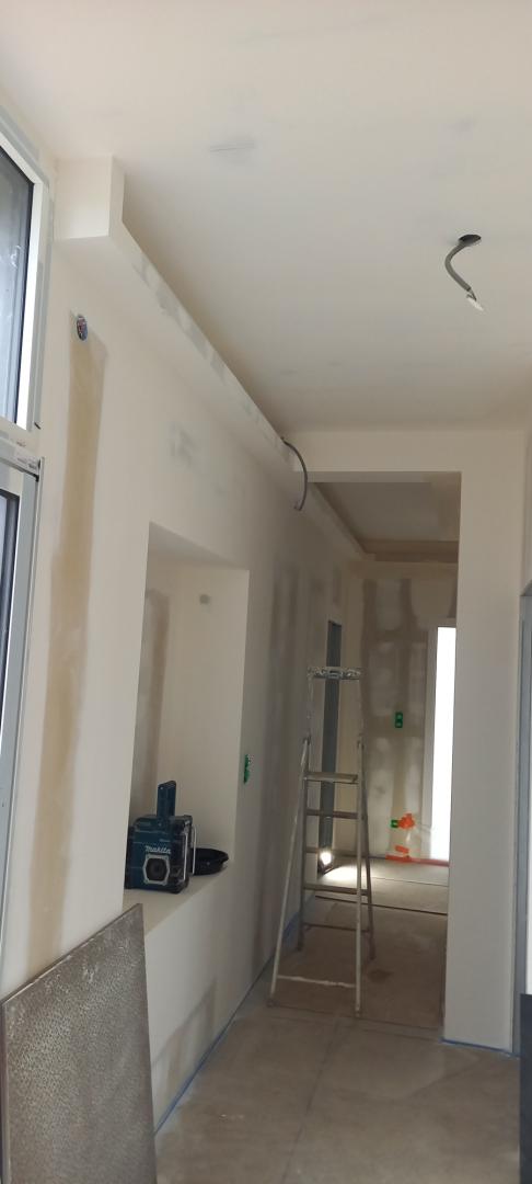 - La finition : Fixée sur l’ossature métallique réalisée, nous posons des plaques de plâtres et réalisons les bandes de finitions.