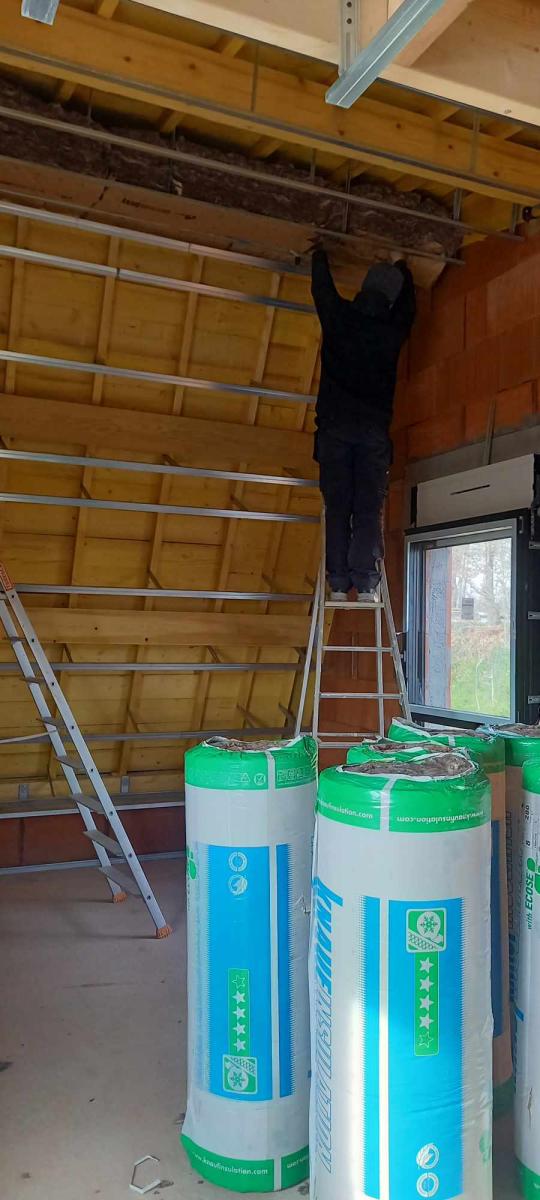 - L’isolation : Un isolant est posé dans l’ossature métallique au préalable installée (laine de verre, laine de roche, laine de bois…)